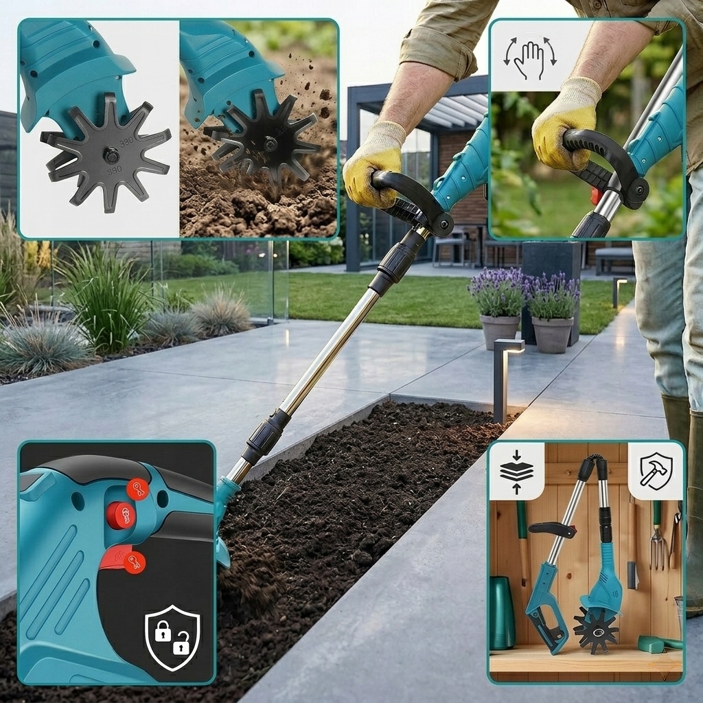 Dzięki mocnemu silnikowi oraz ostrym, stalowym zębom urządzenie skutecznie spulchnia glebę, ułatwiając sadzenie i pielęgnację roślin. Bezprzewodowa konstrukcja zapewnia pełną swobodę pracy – bez kabli, paliwa i hałasu.