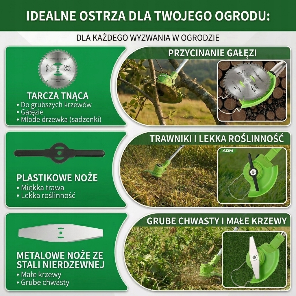 ✂️ 3 rodzaje ostrzy – jedno urządzenie do trawnika, gęstych chwastów, a nawet gałęzi.