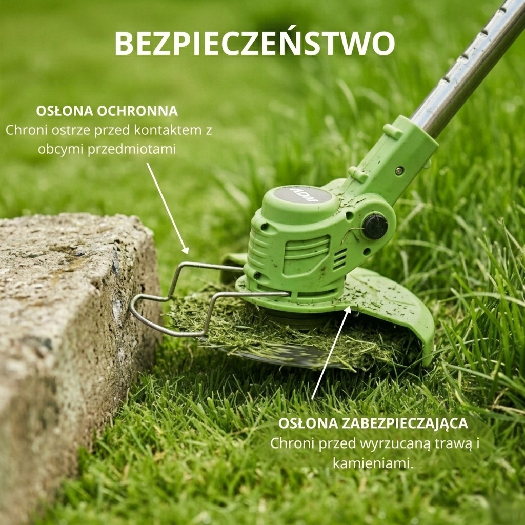 ✔️ Wszechstronność 3w1 – plastikowe ostrza do trawy, metalowe do chwastów i tarcza do krzewów.